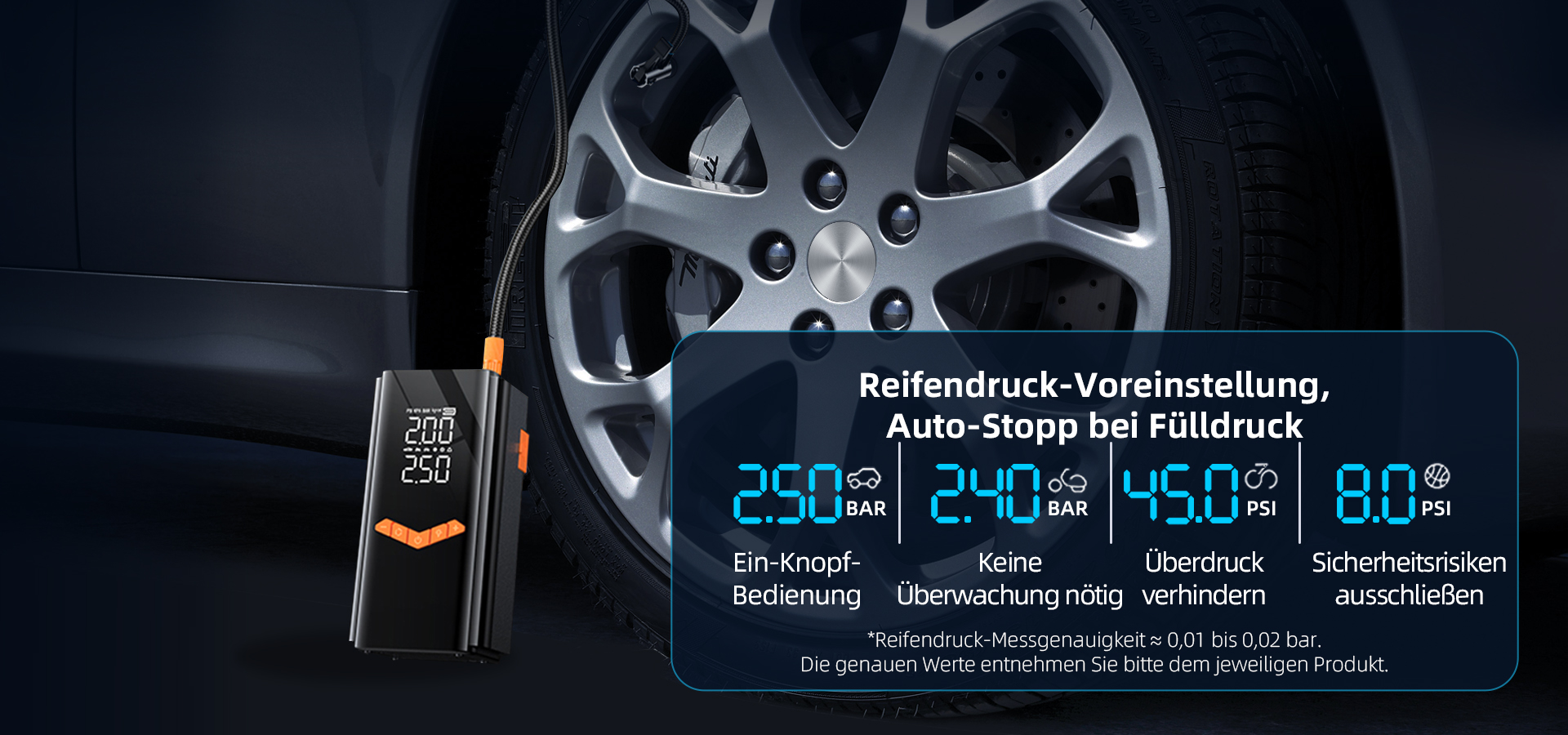 • Automatische Abschaltung bei Erreichen des voreingestellten Drucks