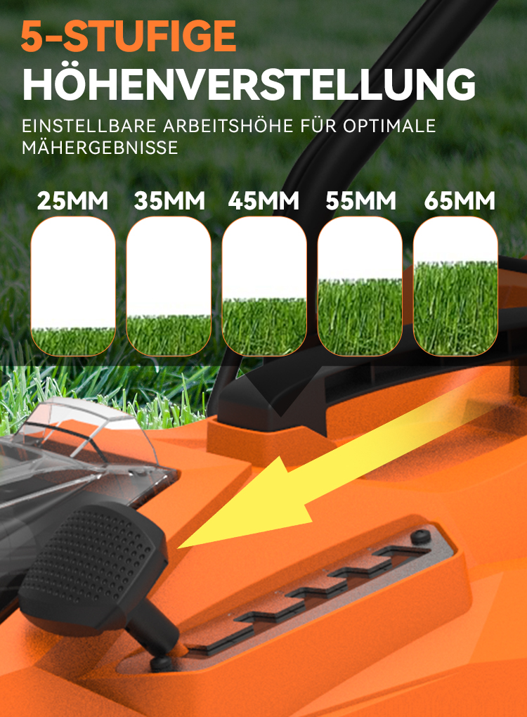 Passen Sie die Schnitthöhe ganz einfach von 25-65 mm an – mit zentraler Ein-Knopf-Bedienung für den perfekten Rasen.