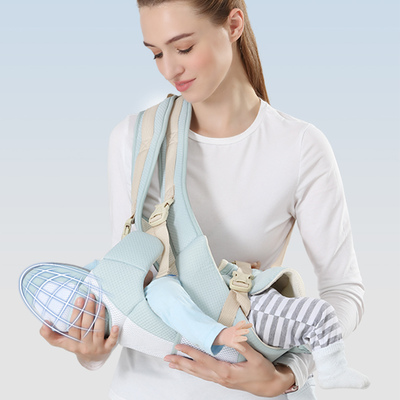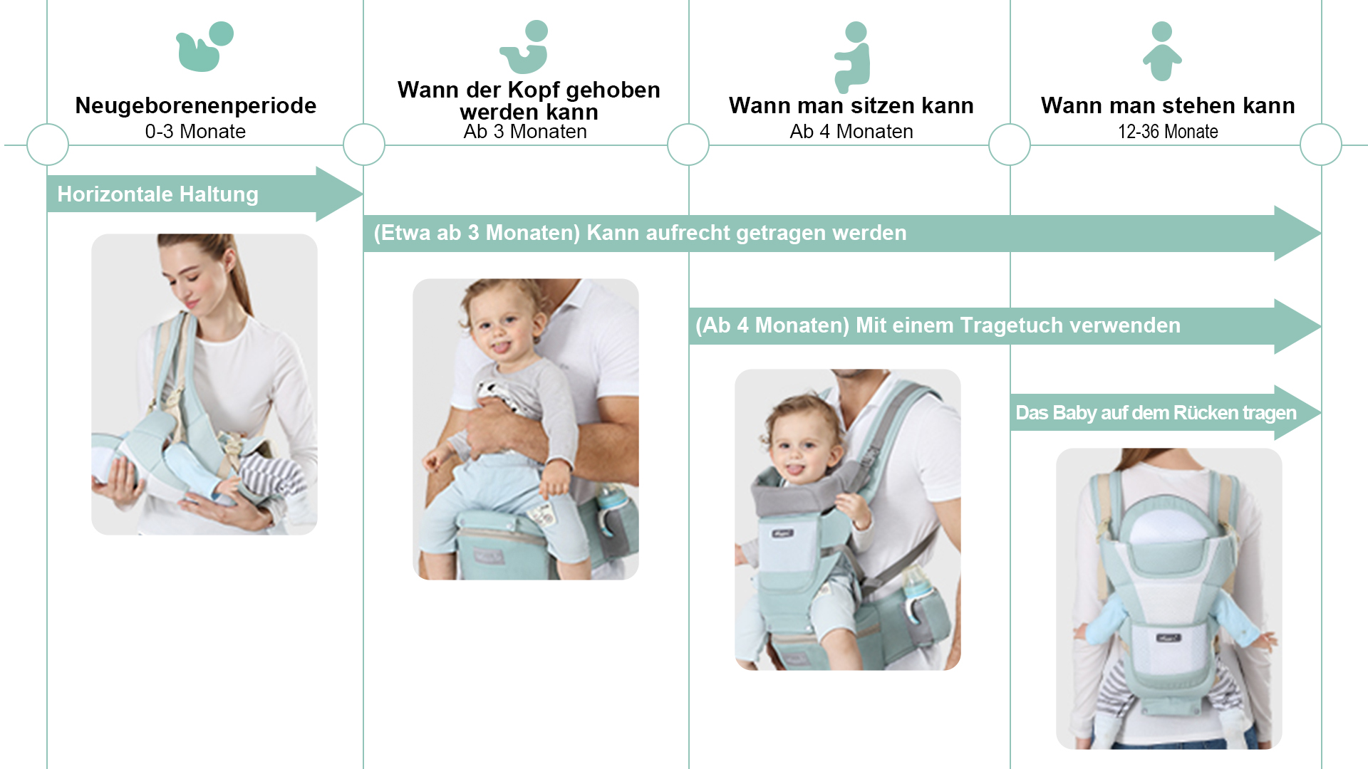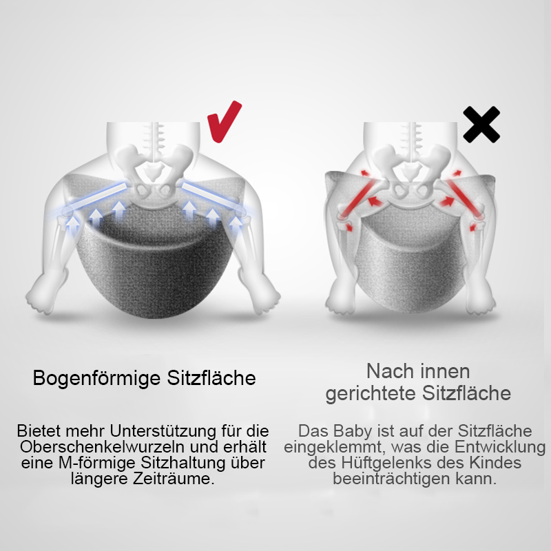 Babys sollten in einer Position getragen werden, bei der ihre Beine gespreizt sind und die Knie ungefähr auf der gleichen Höhe wie die Hüften liegen. Dies reduziert die Belastung der Hüftgelenke und hilft, einer Hüftdysplasie vorzubeugen.