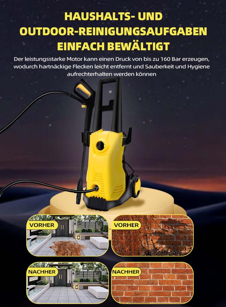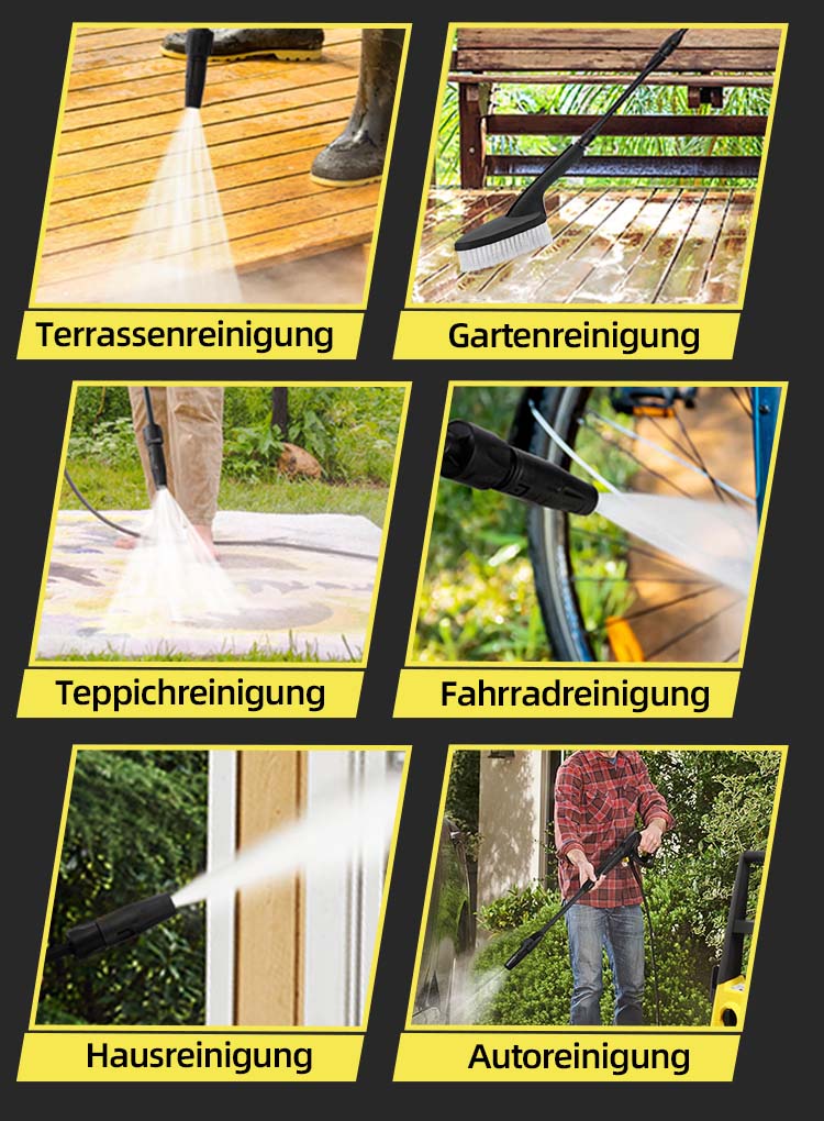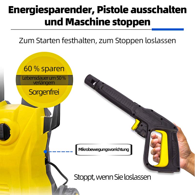 Unser Hochdruckreiniger verfügt über ein robustes, wasserdichtes Design, das selbst in den anspruchsvollsten Umgebungen eine zuverlässige Leistung gewährleistet. Egal, ob Sie Projekte im Freien oder Reinigungsaufgaben im Innenbereich in Angriff nehmen, er ist so konstruiert, dass er dem Kontakt mit Wasser standhält, ohne dass Effizienz oder Sicherheit darunter leiden, was die Lebensdauer des Geräts verlängert.