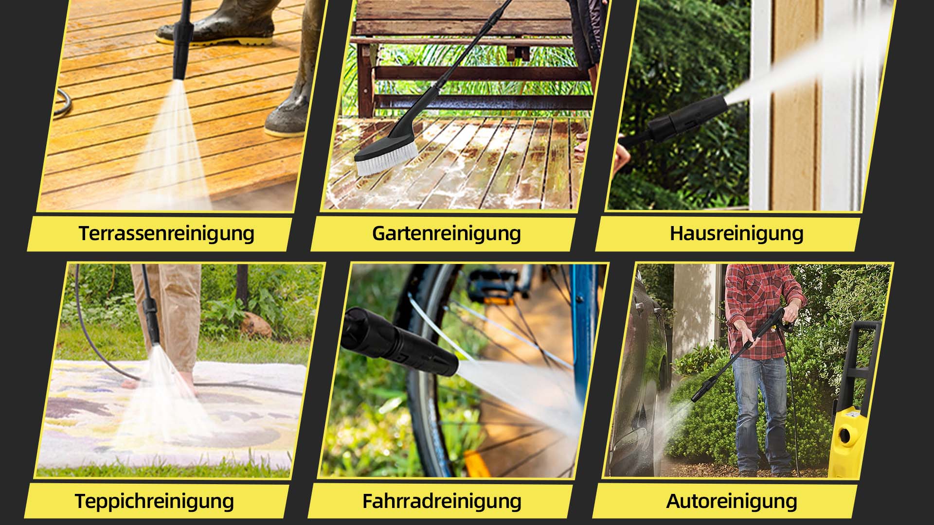 Mit besonders effektiven weichen Borsten erhöht diese Bürste die Reinigungsleistung des Hochdruckreinigers. Sie eignet sich perfekt für den Einsatz auf einer Vielzahl von Oberflächen, darunter Gartenmöbel, Glas, Autos und Fahrzeuge. Sie hilft Ihnen, große Außenbereiche und Reifen schnell und einfach zu reinigen.
