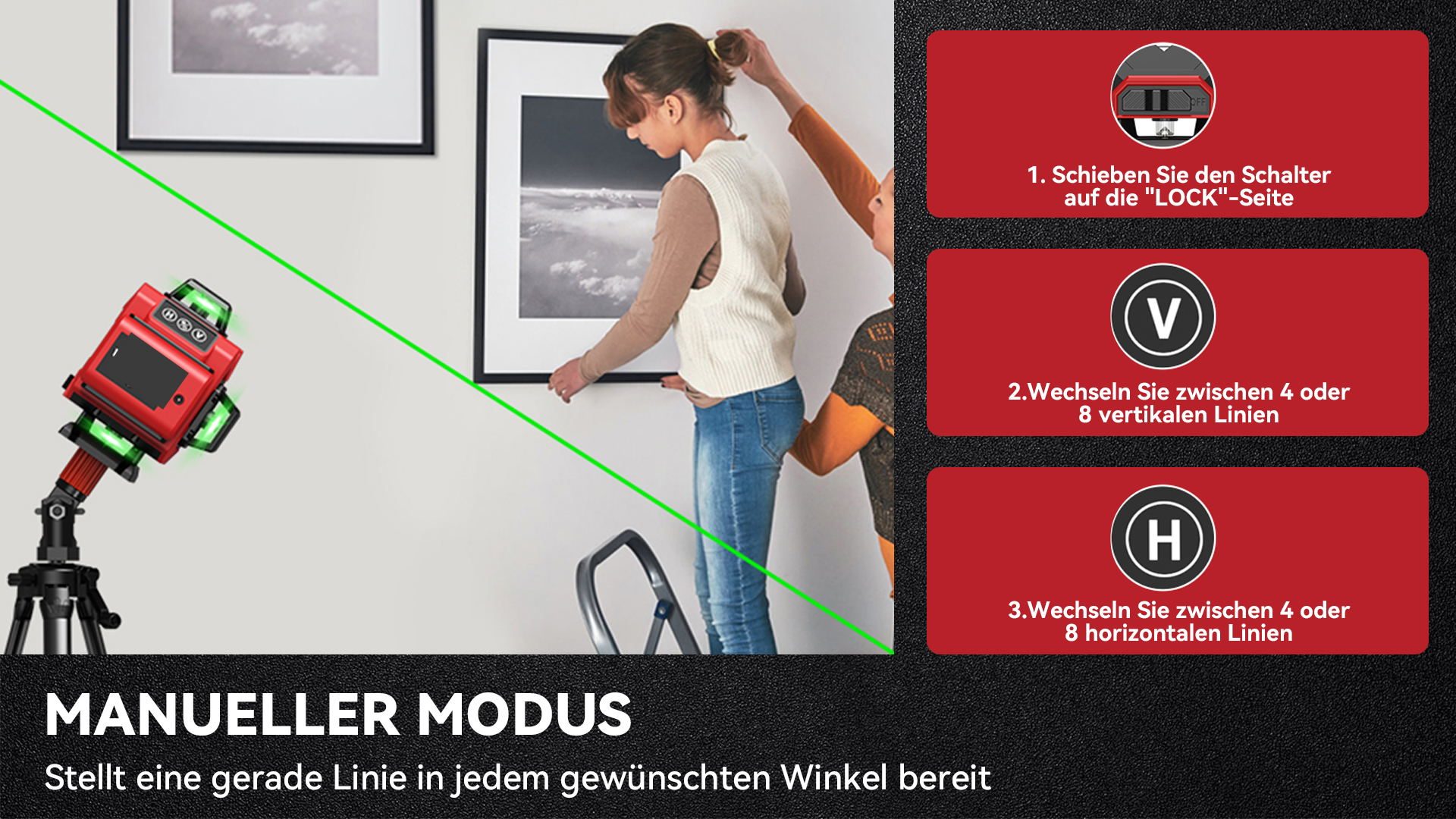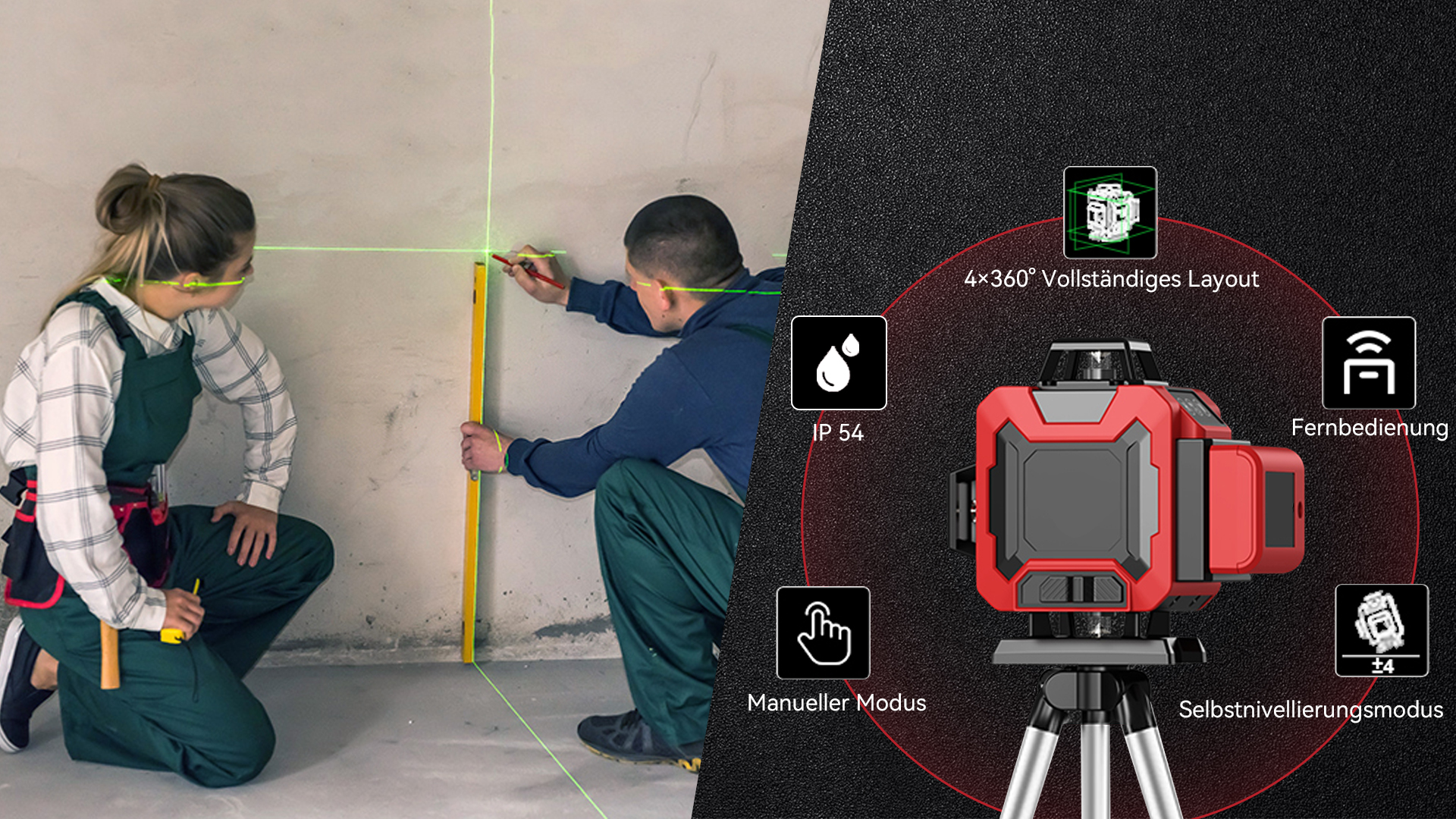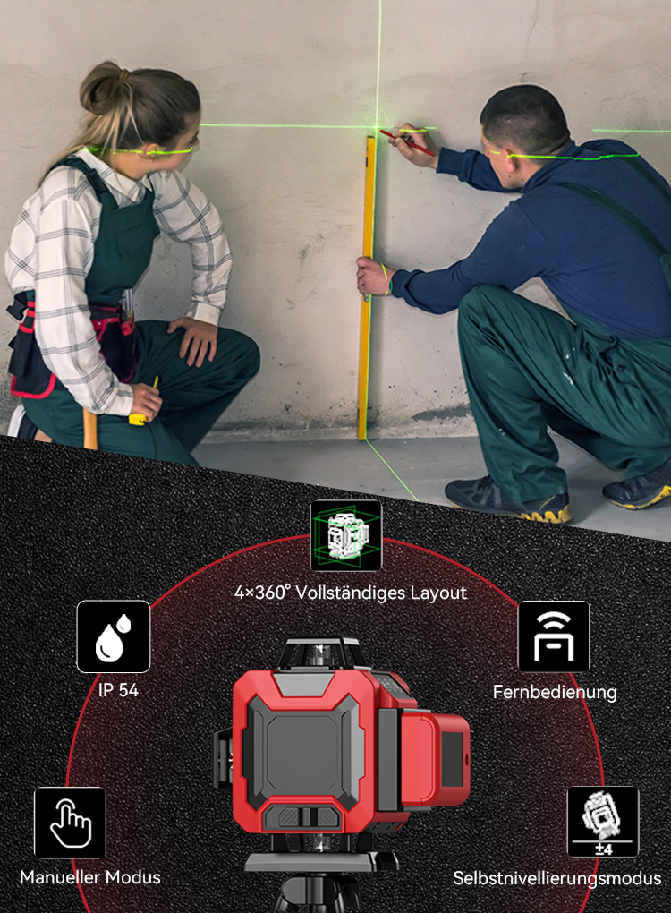 Unser Kreuzlinienlaser verfügt über fortschrittliche Funktionen wie eine Selbstnivellierungsfunktion, vielseitige Montagemöglichkeiten und einen erweiterten Projektionsbereich, wodurch er ein unverzichtbares Werkzeug für eine Vielzahl von Projekten wird. Das Gerät sorgt für perfekt gerade und ebene Linien, wodurch manuelle Anpassungen oder traditionelle Wasserwaagen überflüssig werden, was Zeit und Mühe spart. Stellen Sie es einfach auf, und der Selbstnivellierungsmechanismus passt sich automatisch an, um präzise Messungen zu gewährleisten.