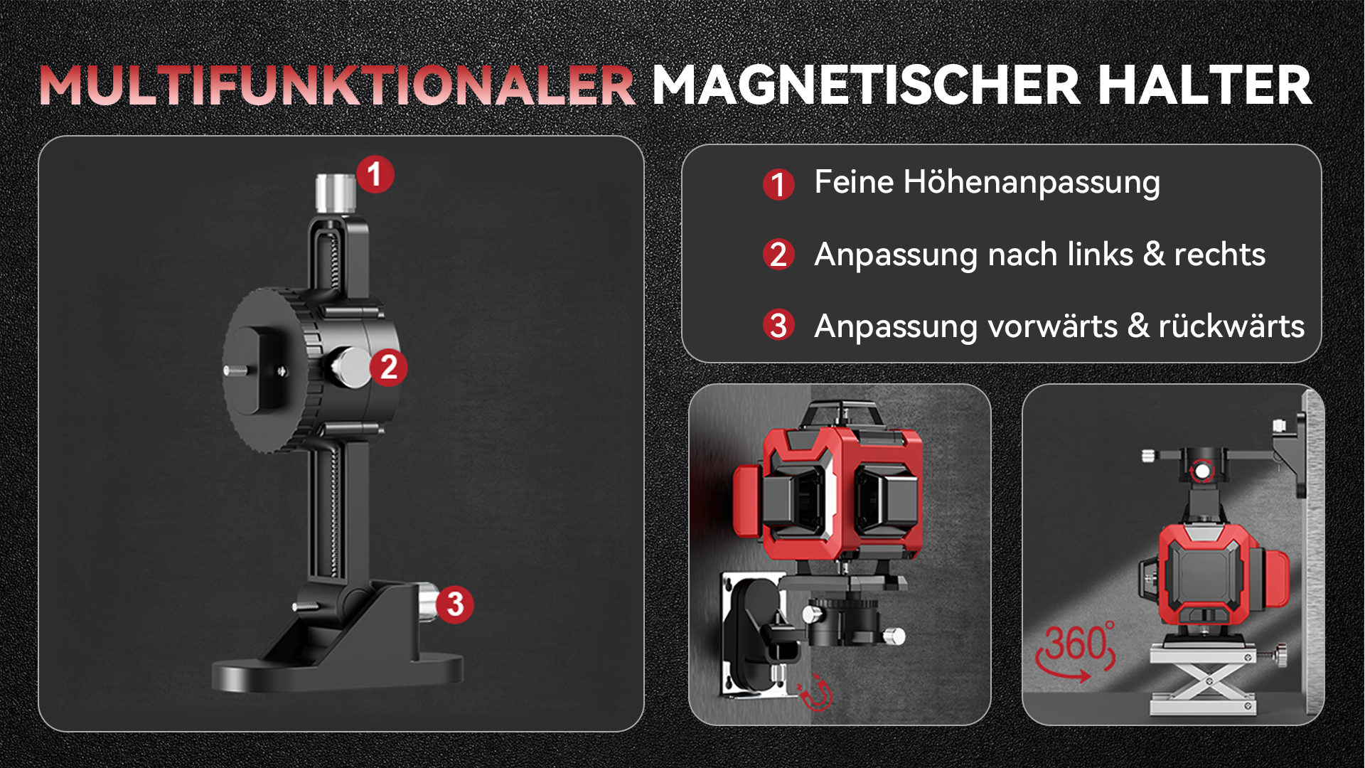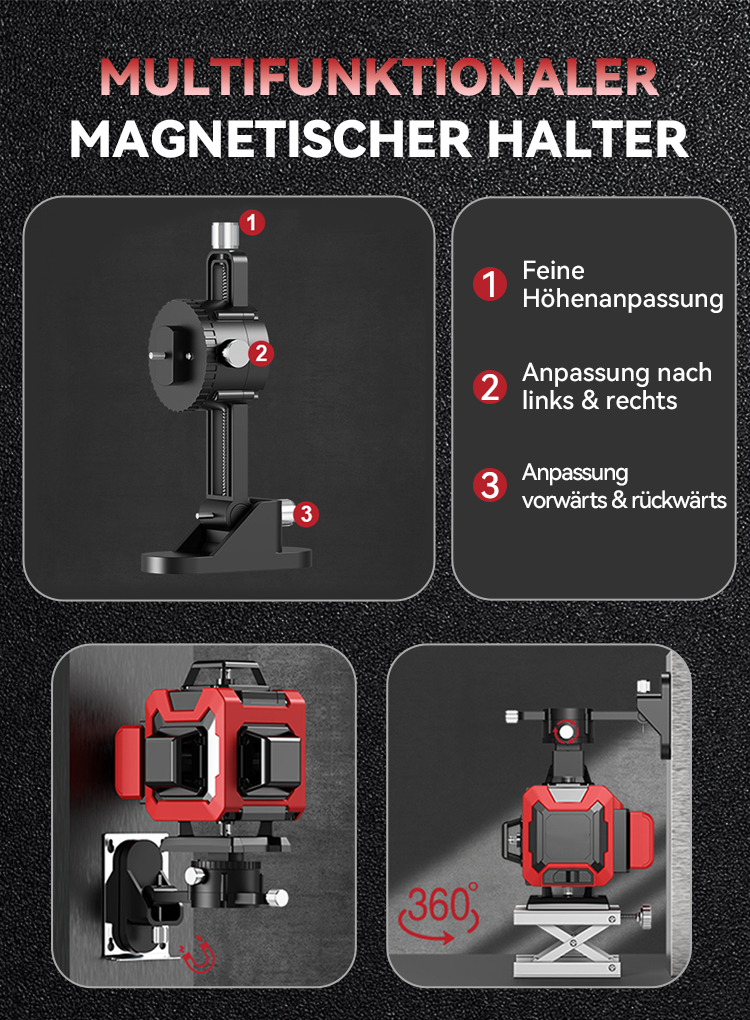 Dieses Gerät ist mit 1/4"- und 5/8"-Stativen kompatibel. Dank der verschiedenen Befestigungsoptionen ist es äußerst vielseitig und einfach zu montieren. Die einfache Bedienung erleichtert das Arbeiten erheblich, da der Kreuzlinienlaser die genaue Ausrichtung übernimmt, ohne dass zusätzlicher Aufwand erforderlich ist. Die stabile Halterung erhöht die Flexibilität und ermöglicht eine problemlose Befestigung an verschiedenen Oberflächen.