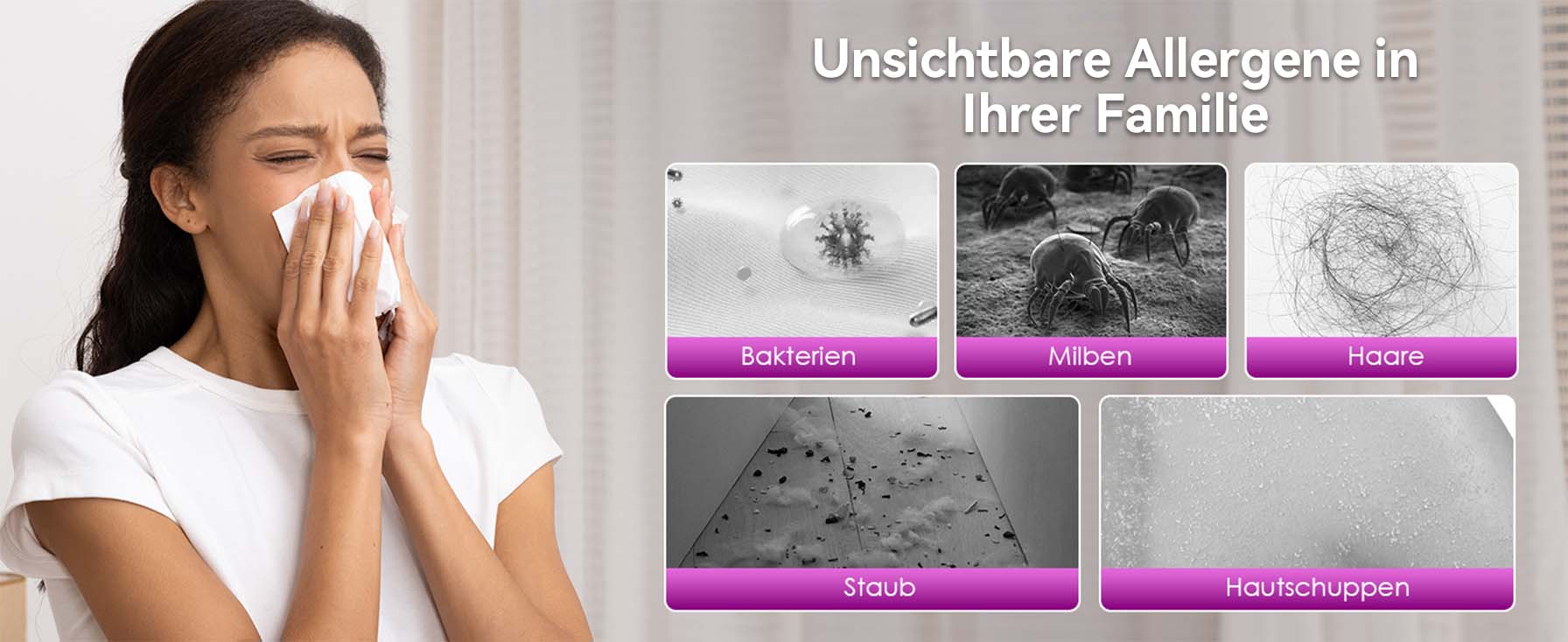 253,7 nm UV-C-Licht tötet 99,9% der Bakterien und Milben ab.