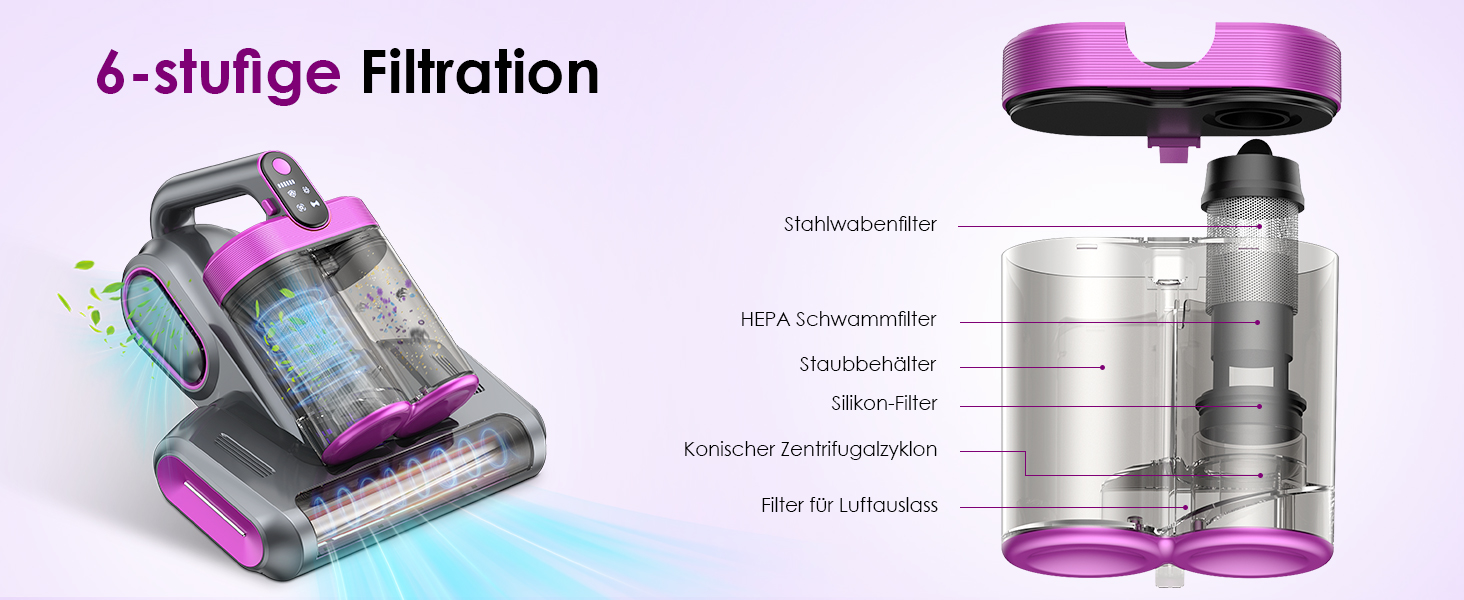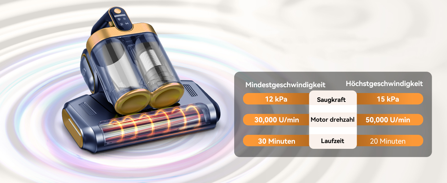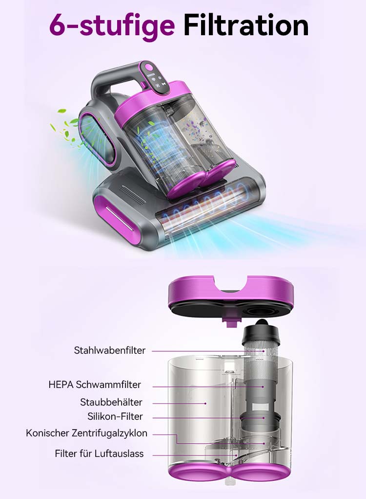 Die kombinierte 15 kPa Saugkraft entfernt zuverlässig Milben, Staub und Hautschuppen.