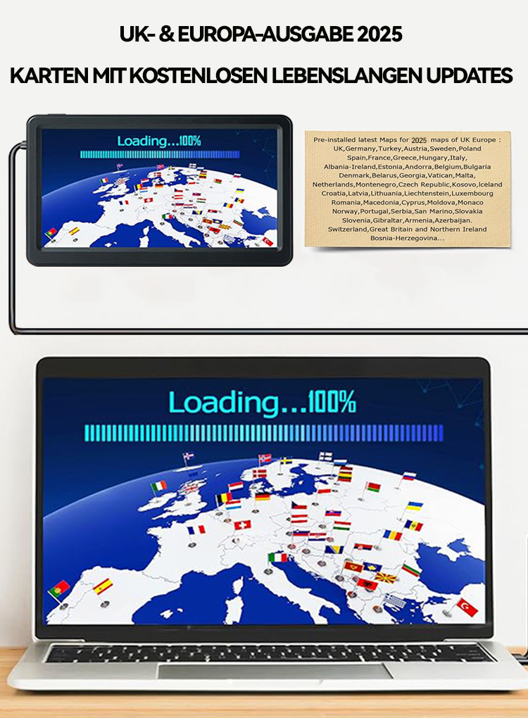 Aktuelle Karten für Europa (inkl. Großbritannien) sind bereits vorinstalliert, sodass Sie das Gerät überall in Europa einsetzen können. Das Beste: Kartenupdates sind lebenslang kostenlos und können online über eine Website heruntergeladen werden – ganz ohne Abo.