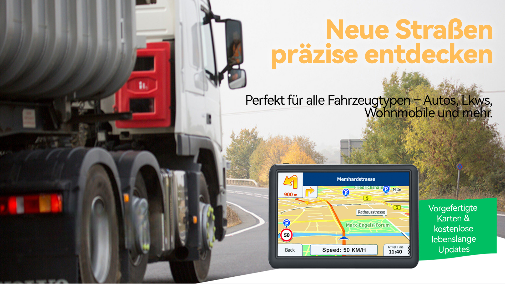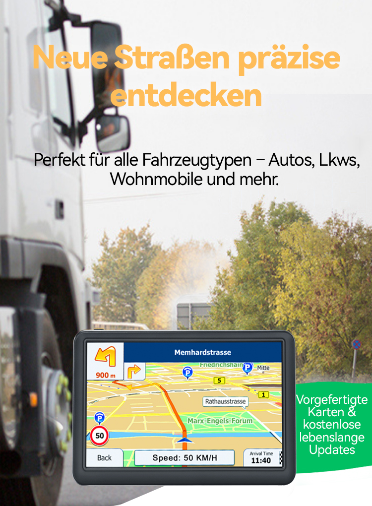 Hinweis: Bitte laden Sie das Navigationsgerät nach dem Auspacken vollständig mit dem mitgelieferten KFZ-Ladegerät auf. Sollte kein Satellitensignal empfangen werden, probieren Sie es im Freien – möglicherweise liegt das Problem an Gebäuden oder Wänden in Innenräumen.