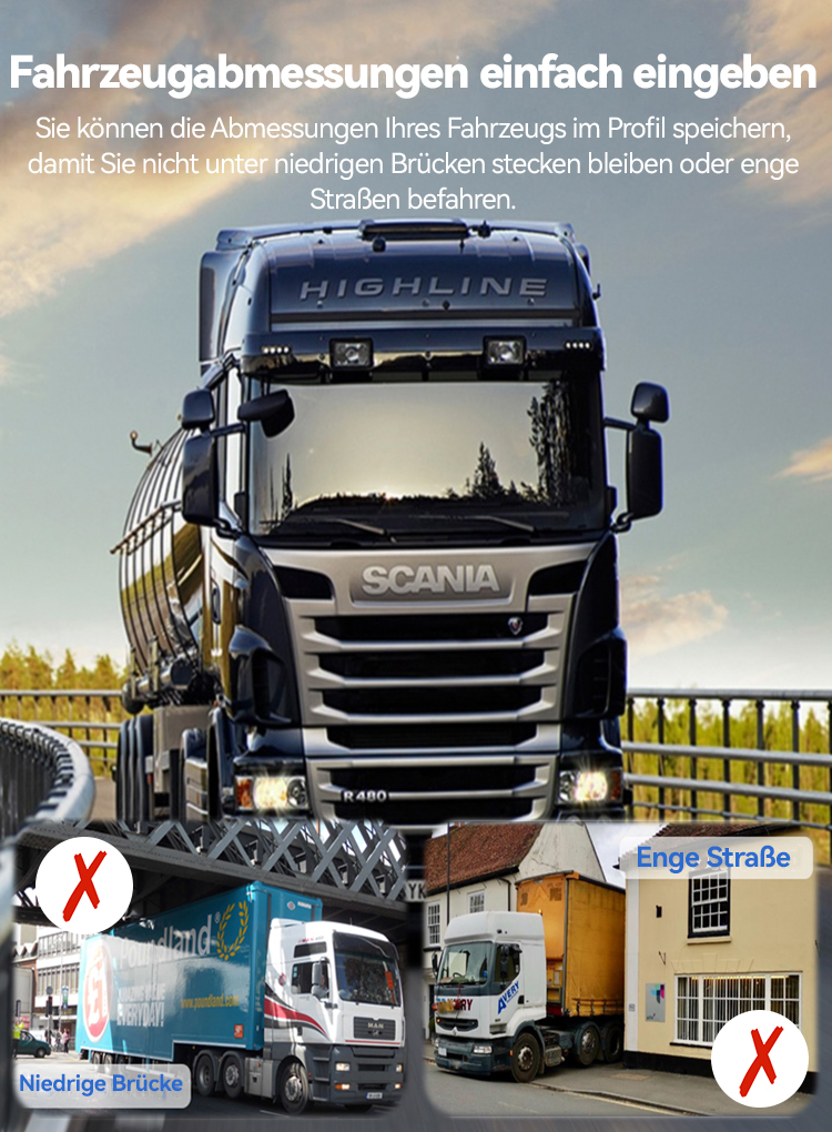 Das System bietet eine benutzerfreundliche Oberfläche, die besonders für LKW-Fahrer, Wohnmobil-Camper oder PKW-Reisende geeignet ist. Der Wechsel vom LKW zum PKW erfolgt einfach durch Profiländerung – kein weiteres Navigationsgerät notwendig. Die Einrichtung erfolgt unkompliziert durch Eingabe von Höhe, Breite und Gewicht des Fahrzeugs, um enge Straßen oder niedrige Brücken zu vermeiden.