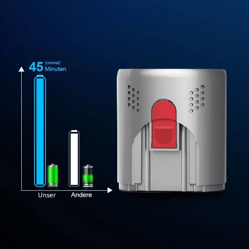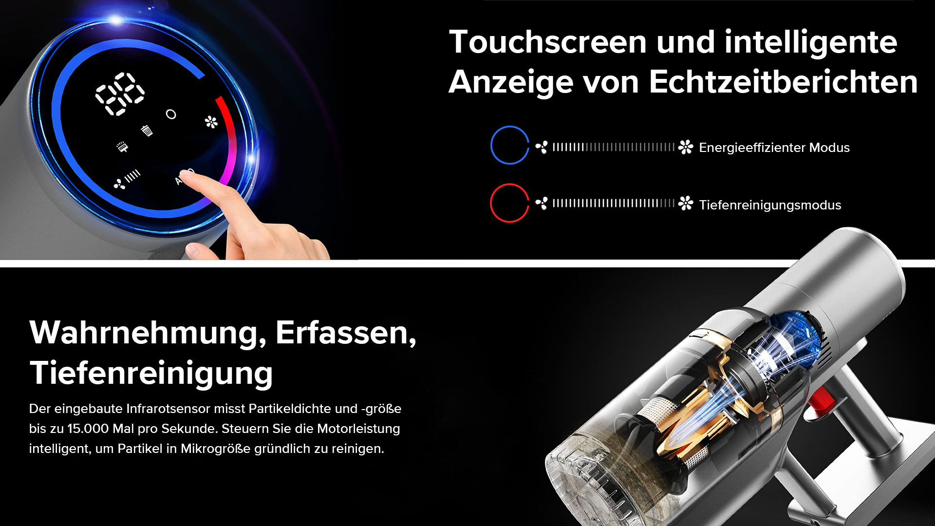 Der kabellose Stabstaubsauger ist mit dem neuesten Dust Smart Sensor System ausgestattet, das die Saugleistung im Automatikmodus automatisch an die erkannte Schmutz- und Staubmenge anpasst, um optimale Reinigungsergebnisse bei gleichzeitiger Maximierung der Laufzeit zu erzielen.