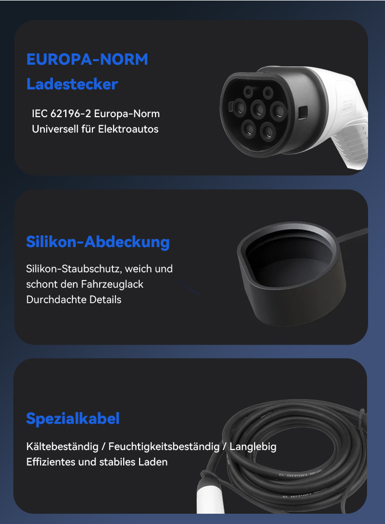 Unsere Typ-2-Ladekabel wurden speziell entwickelt, um den realen Anforderungen europäischer Elektroautofahrer gerecht zu werden.