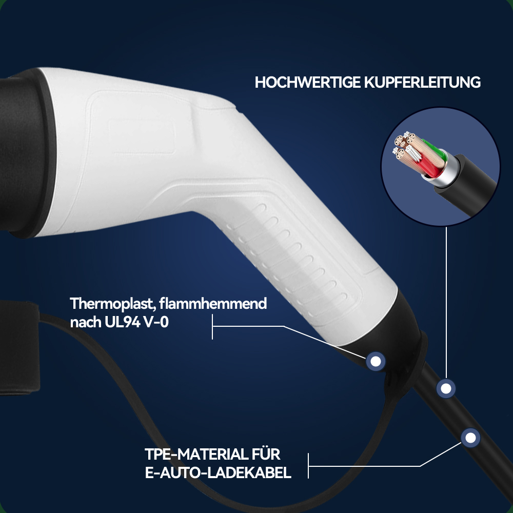 Dieses EV-Ladekabel ist mit hochwertigen Kupferleitern gefertigt und gewährleistet eine effiziente Stromübertragung sowie eine stabile Ladeleistung.